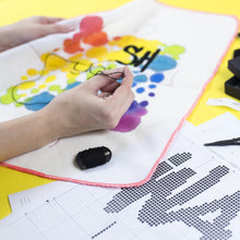 The colour is pre-painted on the fabric and the words are then stitched over the top by you in black DMC embroidery floss.